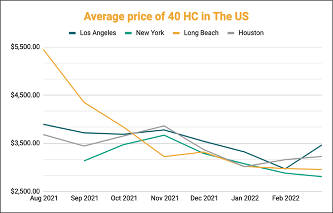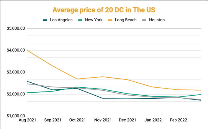 The average container prices for 40 ft HC containers at the port of LA dropped by 20% since late February from $3467 to $2754 in April. These prices are expected to further decrease in the coming few weeks according to the xChange trading insights tool. Similarly, the average price for 20 ft DC at the port of Los Angeles is $1661 as of 11 April 2022.